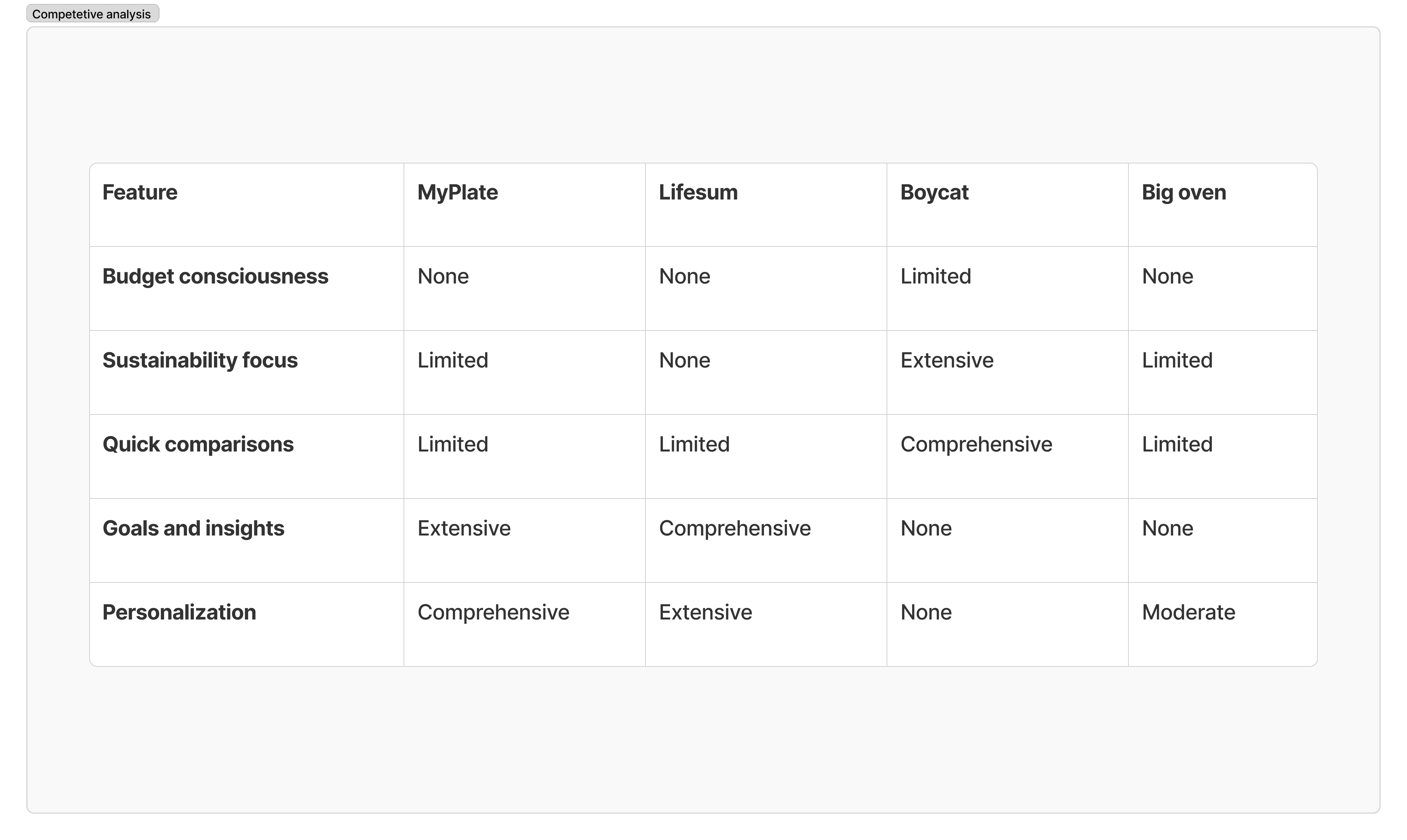 I analyzed four existing apps — MyPlate, Lifesum, Boycat, and Big Oven — across five dimensions: budget consciousness, sustainability focus, quick comparisons, goals and insights, and personalization.