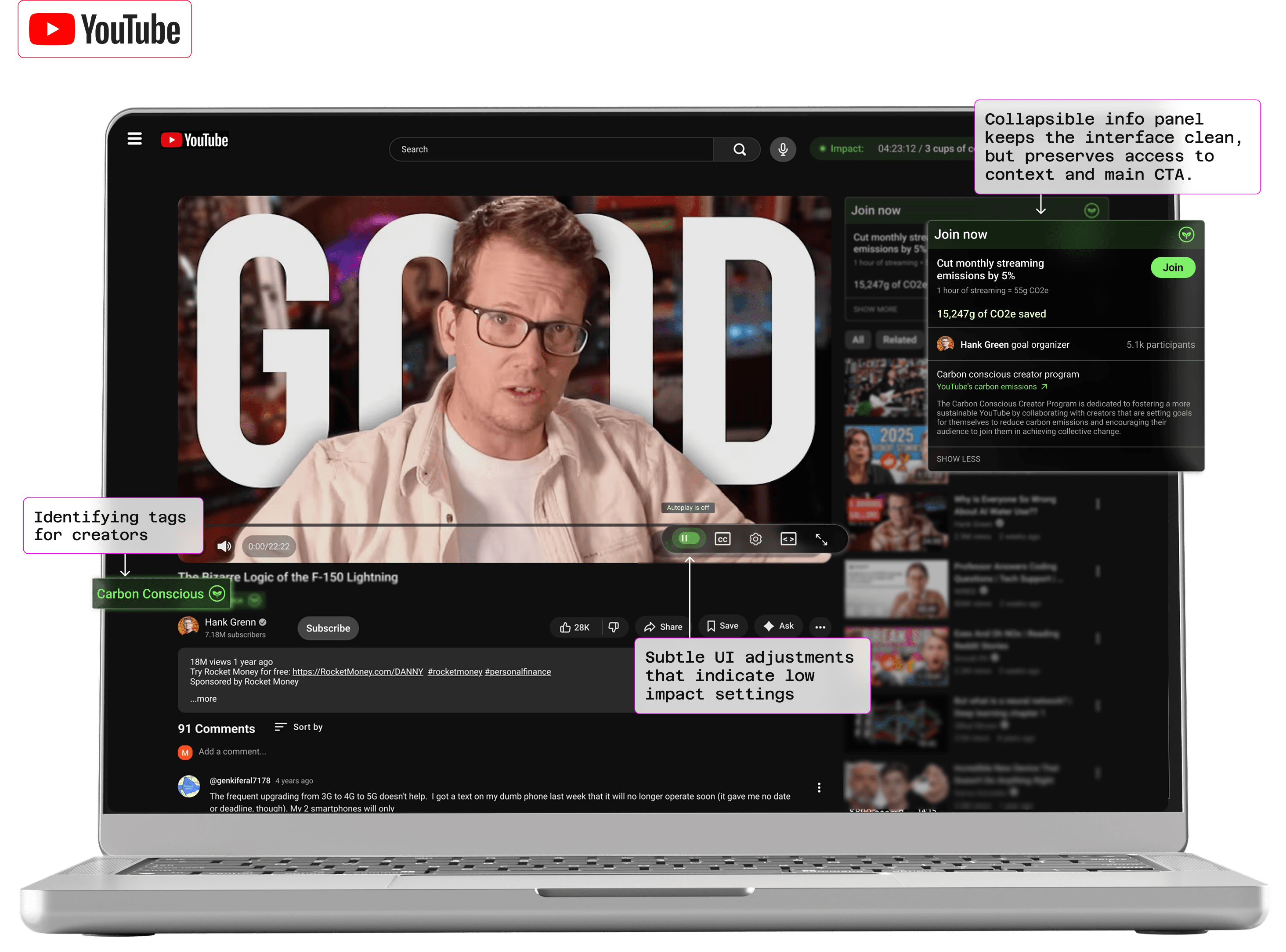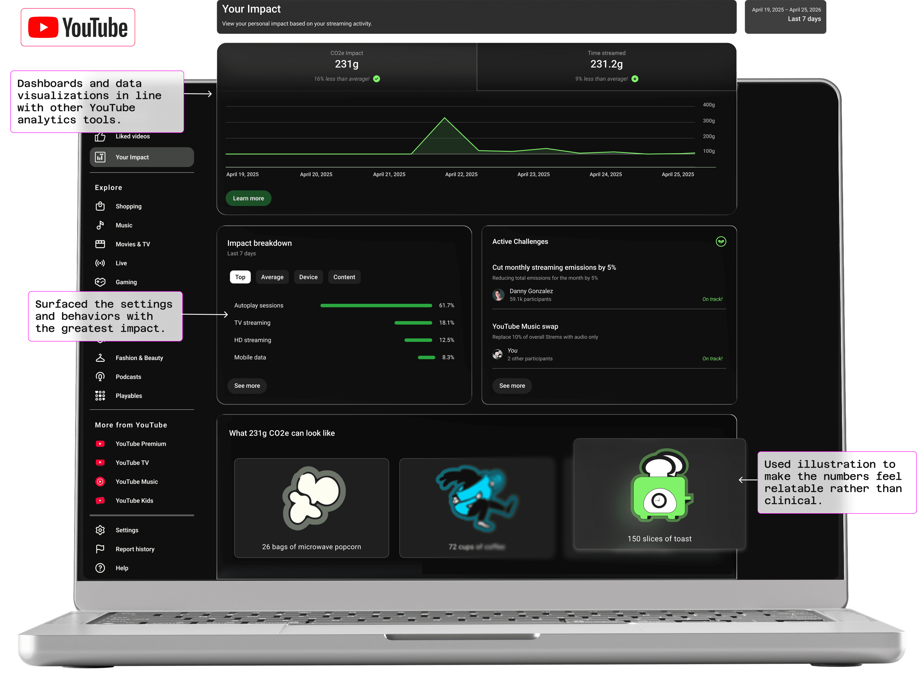 Design transparency into YouTube's existing ecosystem so users can see, understand, and act on their streaming impact.