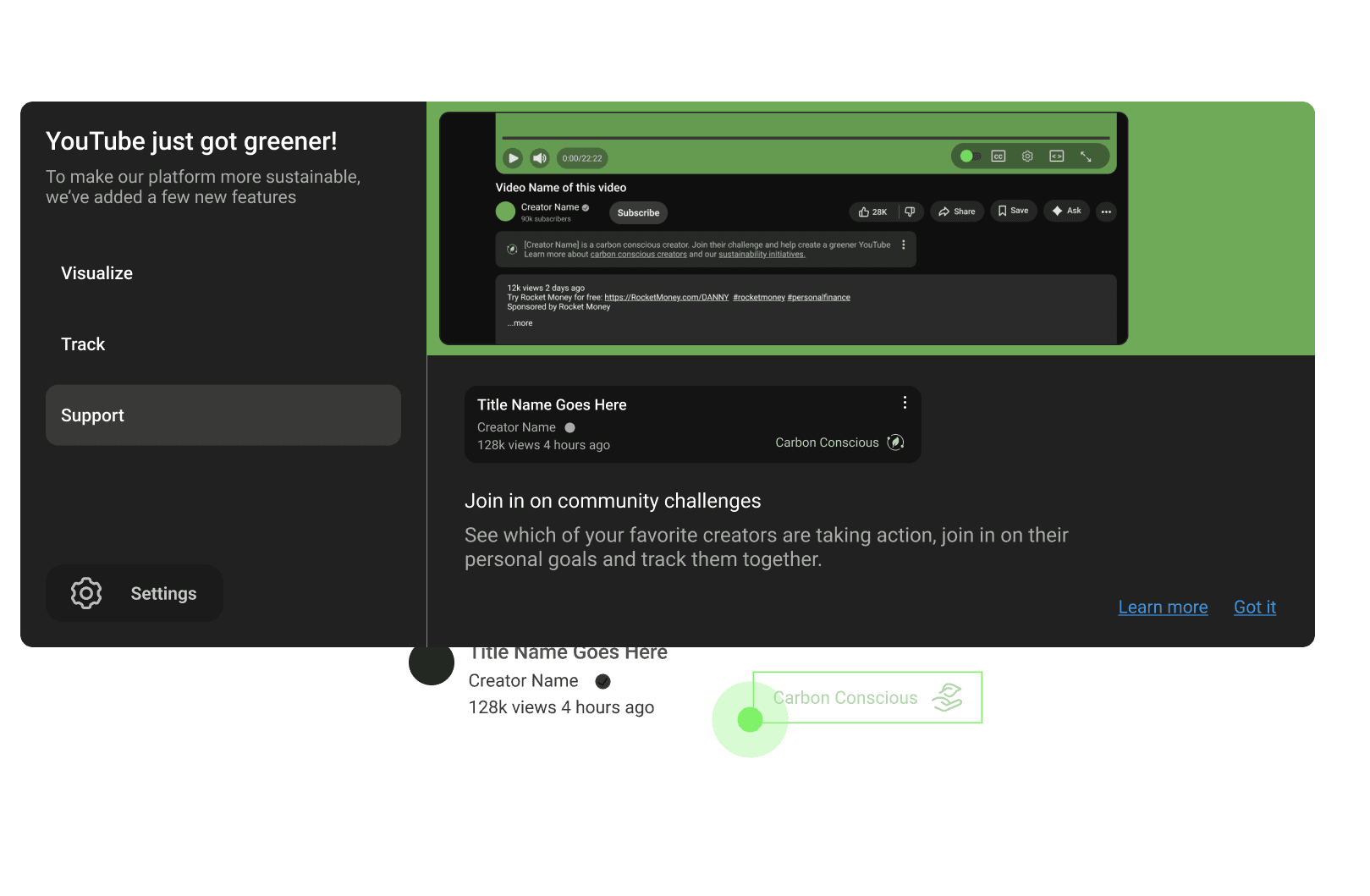 YouTube Green introduces three features that work together to make environmental impact visible at the personal, community, and platform level.